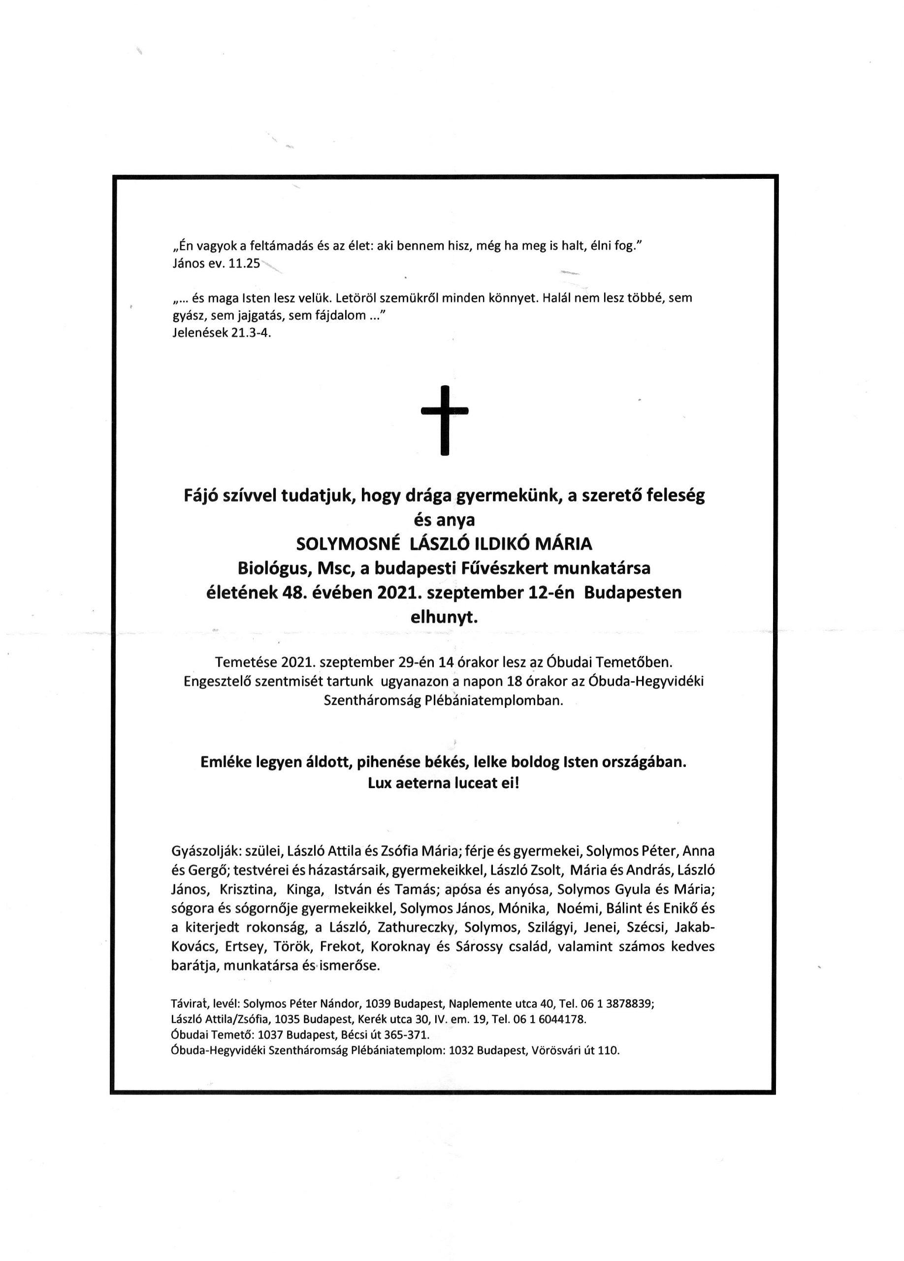 Fájó szívvel búcsúztunk el szeretett Solymosné László Ildikó kolléganőnktől, a Rendszertan, Magcsere és Maggyűjteményük mindig önzetlenül kedves, vidám és precíz kurátorától, aki hosszú betegség után távozott el tőlünk. Emlékét szívünkben őrizzük.