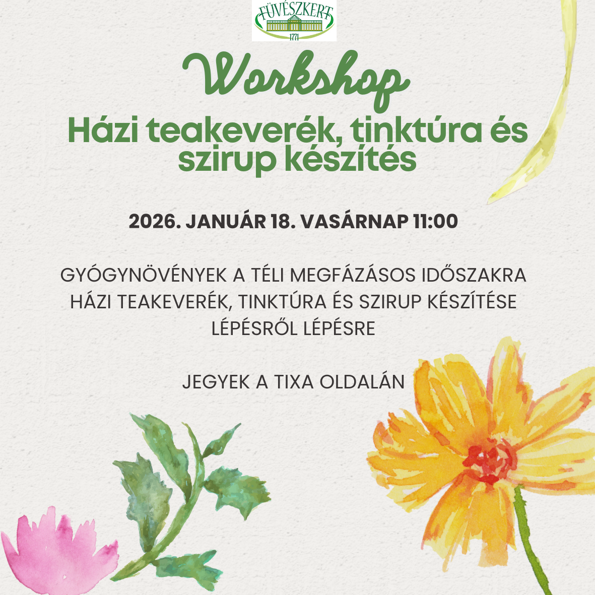 Fegyverkezzünk fel együtt a megfázásos időszakra gyógynövényekkel, és készítsünk közösen egy természetes „védelmi csomagot”, amely megfázásra való teakeverékekből, köhögéscsillapító mézes szirupból és torokfájást enyhítő tinktúrából áll. Miközben mindenki elkészíti a saját készítményeit, mesélek a helyes gyógynövény-használatról, a teakészítés fortélyairól és a gyógynövények hatásairól. Tarts velünk, és vészeljük át mosolyogva a hideg téli napokat!