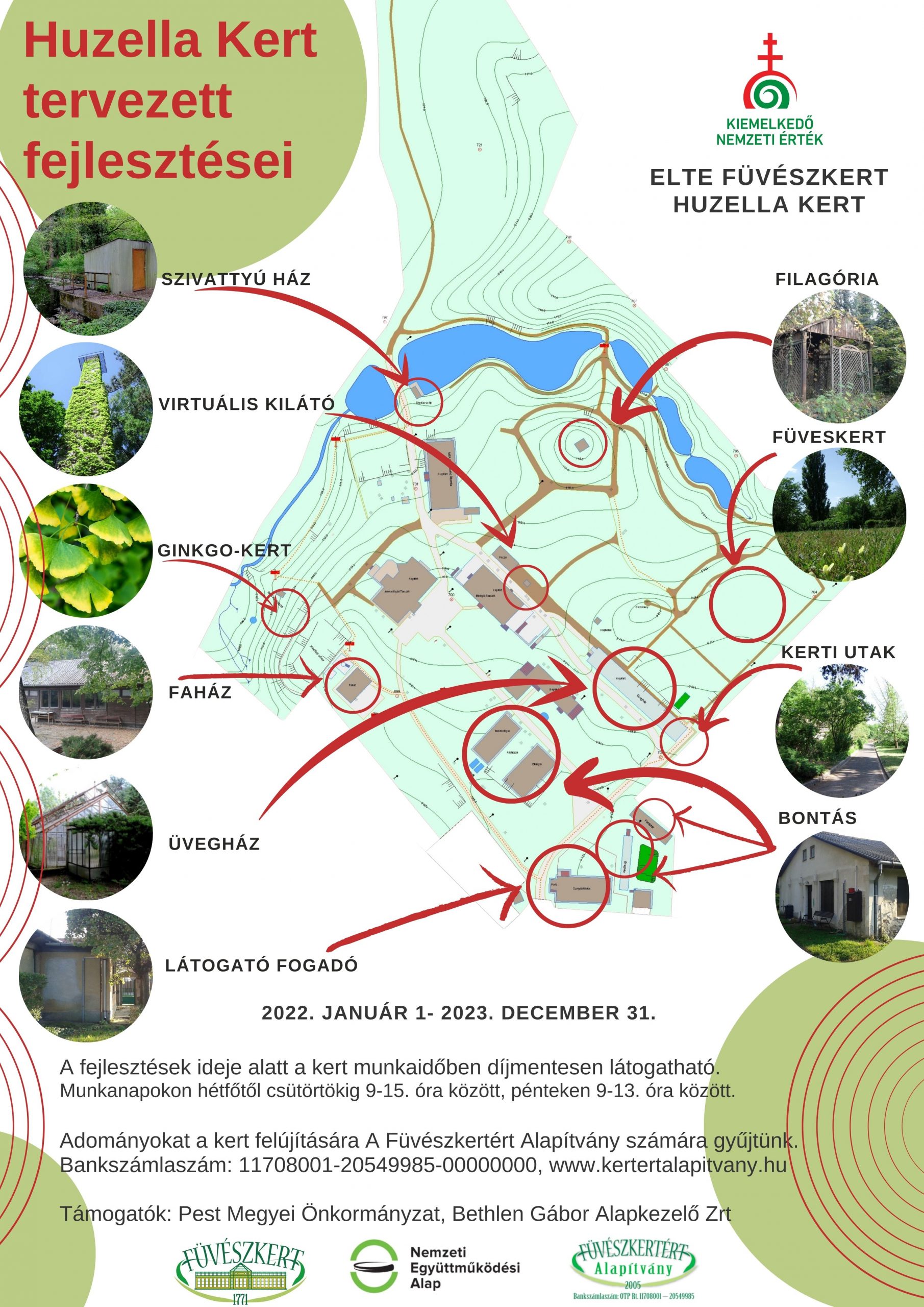 A használaton kívüli, romos épületek bontásra kerülnek, így növelve a kert területét. A kert úthálózata felújításra kerül. Látogatói fogadóépület kerül kialakítása a porta mellet. A régen „Bagoly Tanodaként” működő faház felújításra kerül. A régi kéményből virtuális kilátó lesz, mely tetejéről kamerák segítségével az egész környék panorámája láthatóvá válik. A régi filagória, és a szivattyú ház is felújításra kerül. A kert hasznosítását új funkciók biztosításával próbáljuk bővíteni. A kialakításra kerülő „Füveskert” egy meglévő épületnek adna új funkciót, és a látogatók számára lehetőséget, hogy a helyben termesztett gyógynövényekből saját készítésű termékeket, alkotásokat készítsenek.