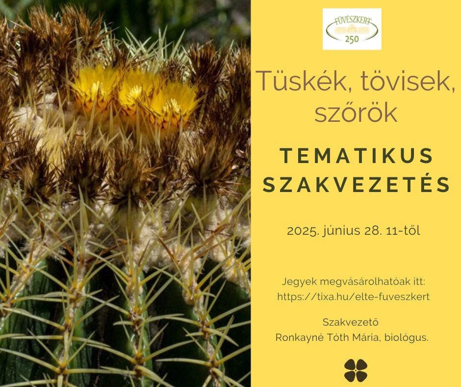 A növények lenyűgözően nagy változatosságot mutat a különböző funkciókhoz, élőhelyi sajátosságokhoz alkalmazkodva. Vannak köztük őrző-védő, fizikai védelmet nyújtó képletek, de vannak fényvisszaverő, hőszigetelő, kapaszkodó, vagy nedveket termelő képletek is. Vannak selymes tapintású, légiesen könnyed, adott esetben repítő növényi szőrök is, de természetjáróként, kertészkedőként gyakorta megtapasztalhatjuk a fájdalmasan szúró tüskéket, hegyes töviseket, vagy a ragaszkodó bojtorjánvirágzatokat. Jogosan merülhet fel bennünk számos kérdés, például, hogy tényleg hatékonyak-e ezek a képletek, hogy van-e köze a sünnek a sünkaktuszhoz vagy a süntökhöz;hogy mit sugall a híres mondás, mely szerint „nincsen rózsa tövis nélkül”? A Botanikuskert illusztris növényeinek és a szakvezetés segítségével választ kaphatunk kérdéseinkre.